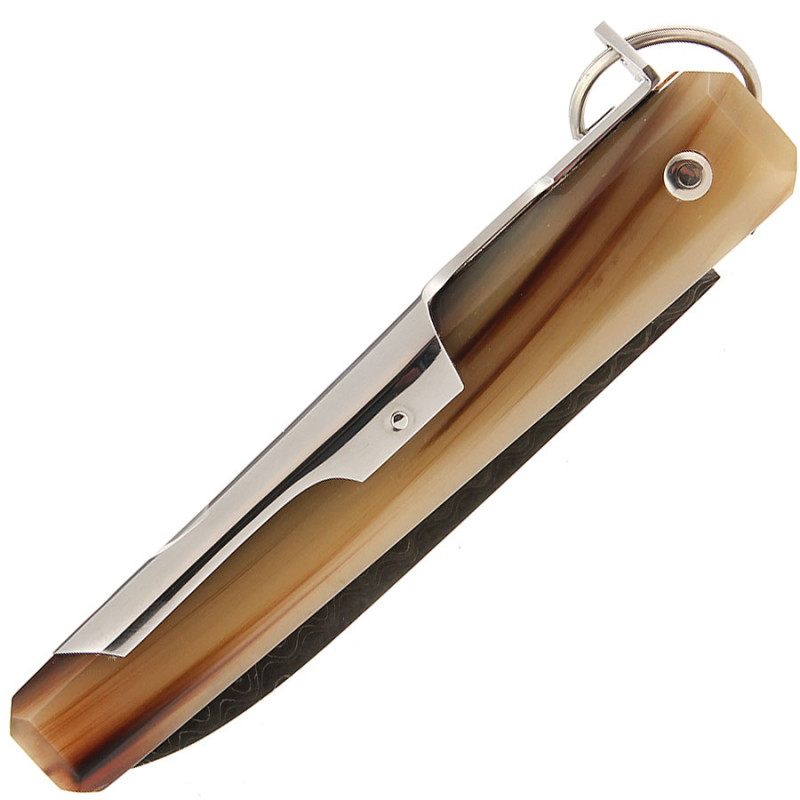 Facette 13 cm corne blonde avec une lame en damas Doursin. Couteau d'occasion à l'état neuf.