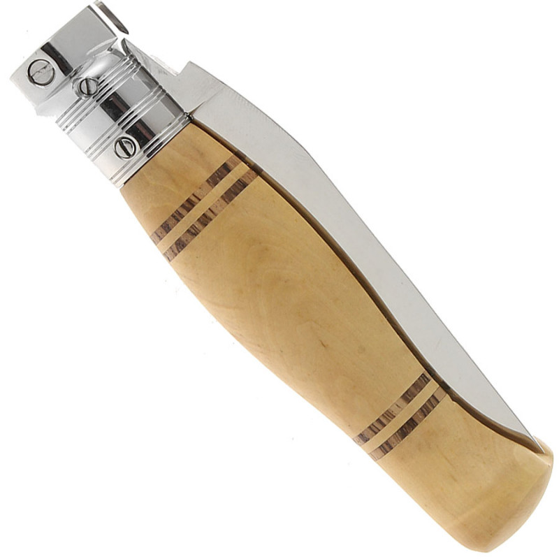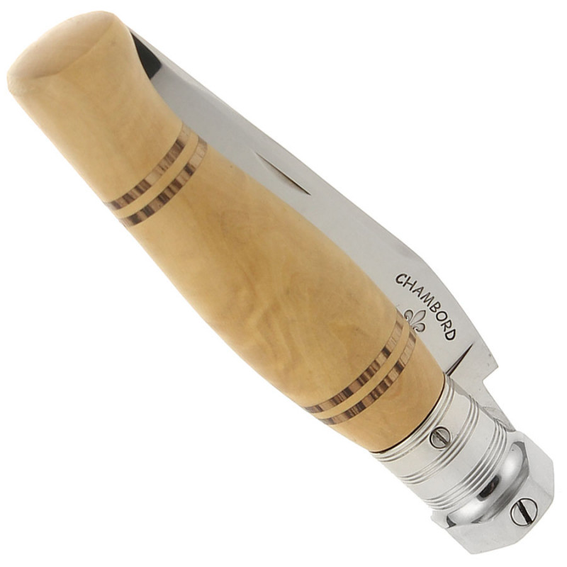 Couteau à système de cran forcé par billes et ressort avec un manche en buis et marqueterie.