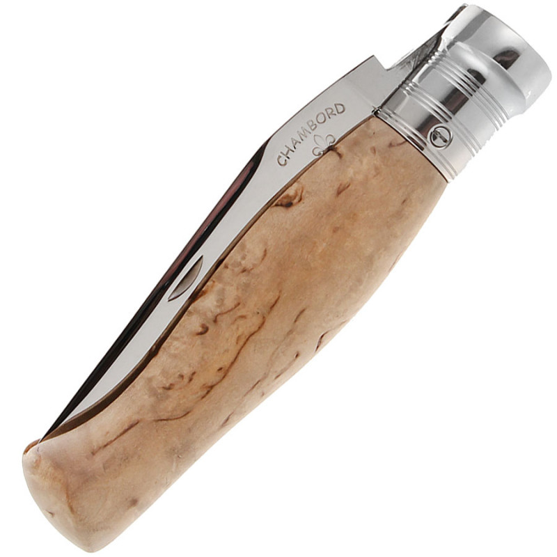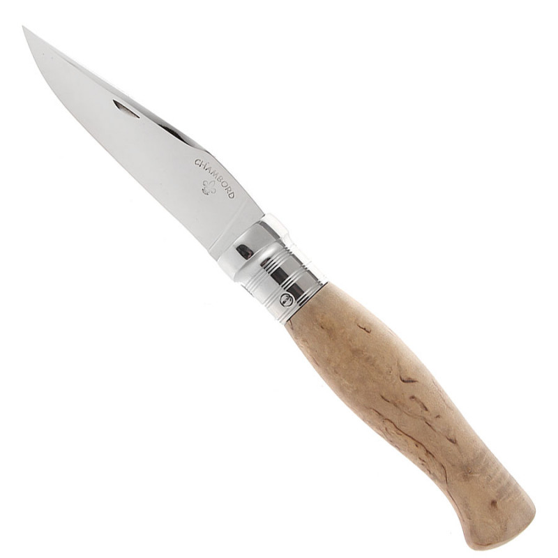 Couteau à système de cran forcé par billes et ressort avec un manche en bouleau.